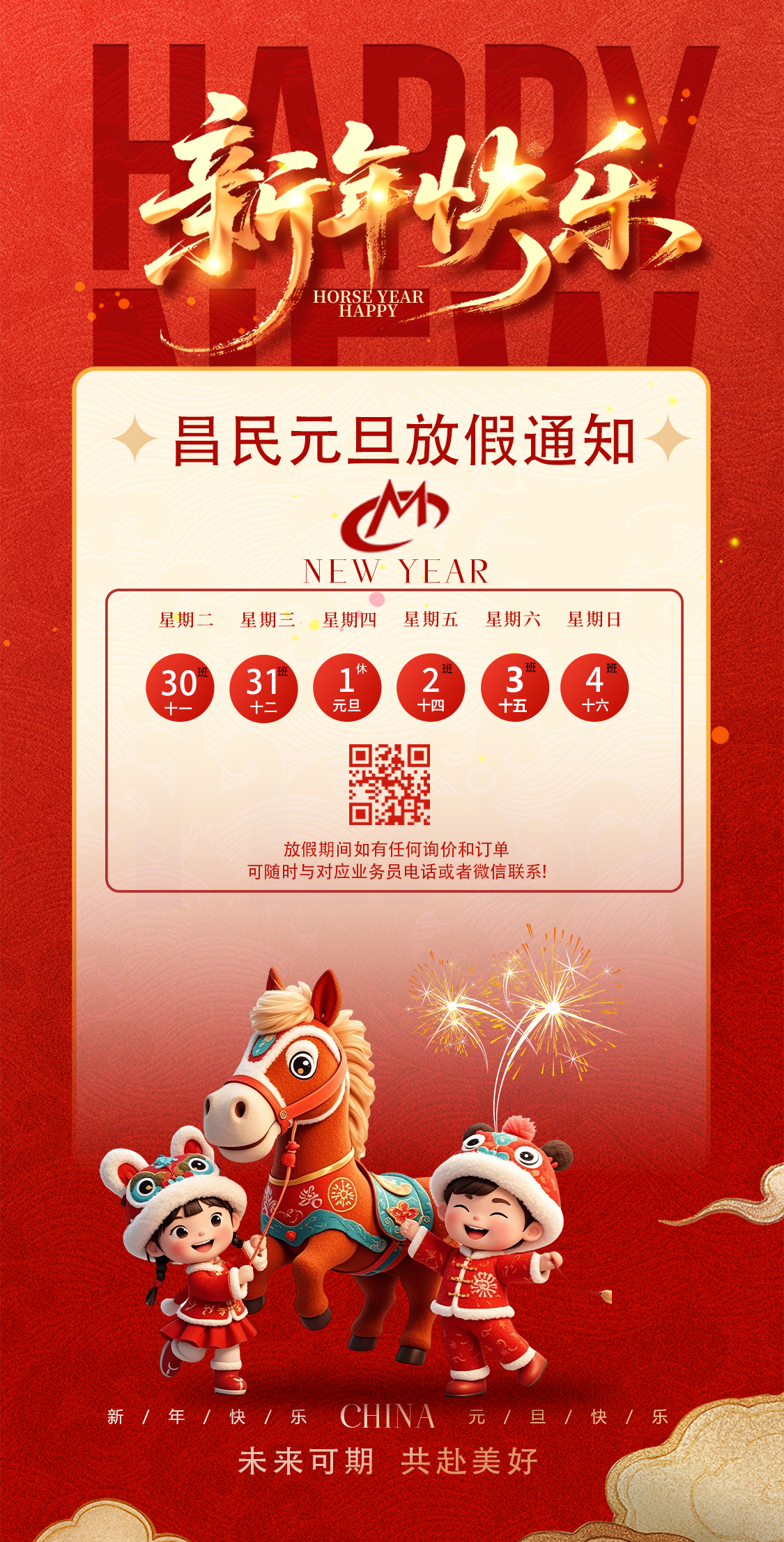 值此元旦佳節(jié)來臨之際,為使大家度過一個平安祥和的假期,根據(jù)國家法定節(jié)假日安排,結(jié)合公司實際情況,我司元旦放假事宜安排如下:2026年1月1日(星期四)共1天,2026年1月2日(星期五)正常上班。在2025年感謝您的信任與支持,讓我們攜手走過不凡的一年!您的每一次選擇,都是我們前進(jìn)的動力;2026 年,我們將以更優(yōu)質(zhì)的產(chǎn)品和服務(wù),與您并肩作戰(zhàn),深化合作,共創(chuàng)雙贏,再攀高峰!在此,昌民預(yù)祝大家元旦快樂、闔家幸福、萬事順?biāo)欤?/span>